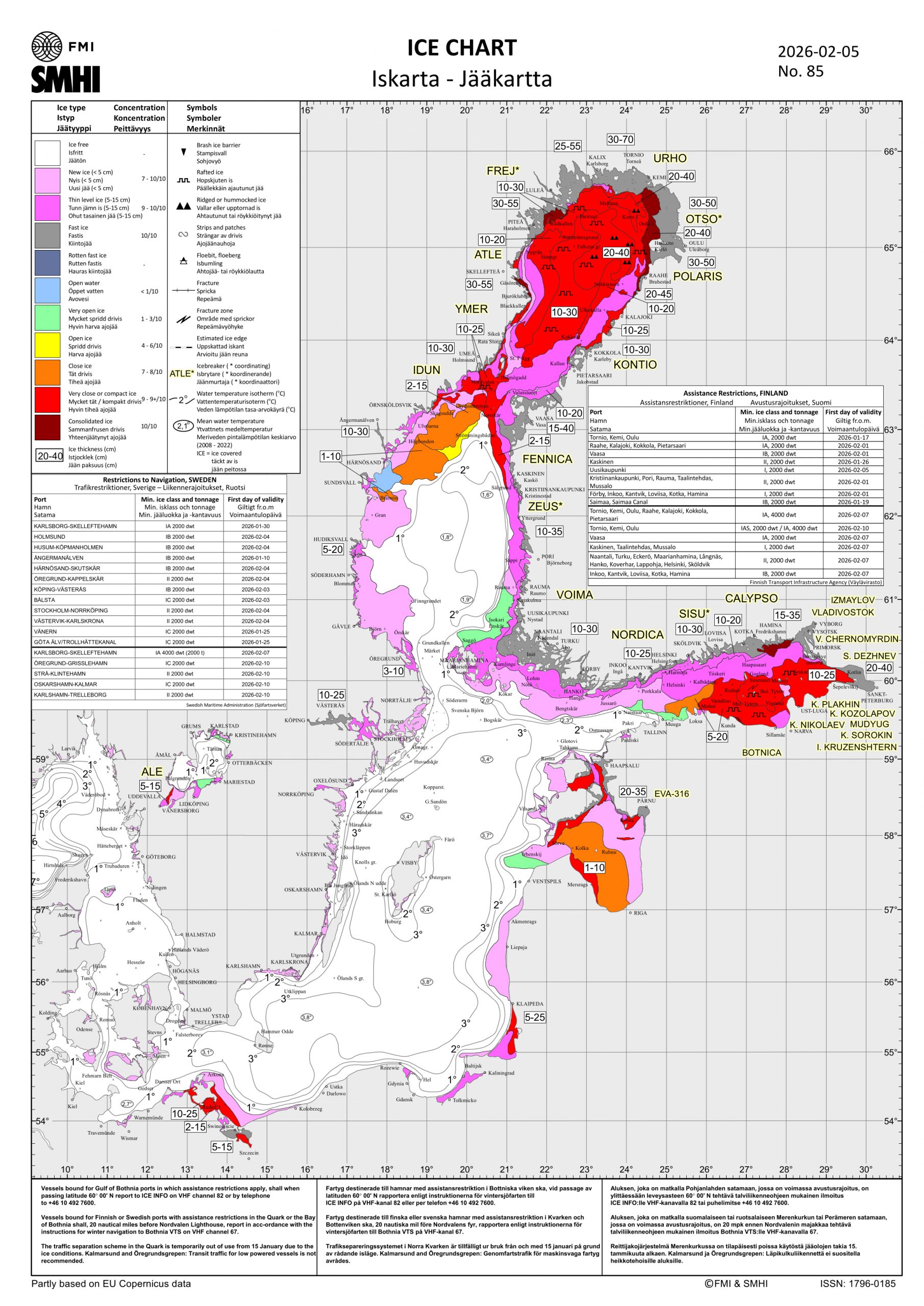 Finnlands Fahrwasser und Häfen sind nun komplett vom Eis eingeschlossen: Die Bottenwiek und Kvarken sind zugefroren, ebenso der Schärengarten zwischen Åland und dem Festland, und der finnische Meerbusen ist auch schon fast dicht. In der Mitte des Bottnischen Meerbusens hat das Wasser zwar noch 2°C, aber an den Ufern gibt es bereits einen breiten Eisgürtel. Um die Frachtschiffe zu den Häfen zu geleiten, hat der staatseigene finnische Eisbrecherdienst Arctia inzwischen alle acht eigenen Eisbrecher losgeschickt, außerdem sind noch zwei zusätzlich angeheuerte eisbrechende Schlepper im Dienst. Der kräftige Eisbrecher Kontio, anfangs im Finnischen Meerbusen eingesetzt, ist jetzt in die Bottenwiek umgezogen, wo das Eis inzwischen teilweise schon mehr als 30 Zentimeter hat.