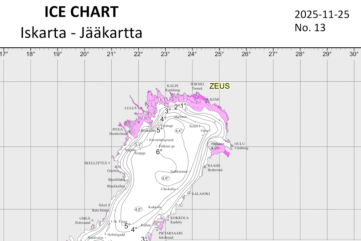 Die Schifffahrt ist bisher noch kaum eingeschränkt. Seit Montag gelten die ersten Beschränkungen für Schiffe bezüglich Eisklasse und Mindesttonnage in Kemi, Tornio und Oulu, ab heute auch in Luleå und Karlsborg (Kalix). Auf der finnischen Seite hat Schlepper/Eisbrecher Zeus of Finland seinen Dienst aufgenommen, während die größeren Kollegen noch in Helsinki warten. In Luleå liegen die schwedischen Eisbrecher Ale, Idun, Atle, Ymer und Frej, sind aber noch nicht aktiv in Bereitschaft. Forschungseisbrecher Oden befindet sich noch in Helsingborg.