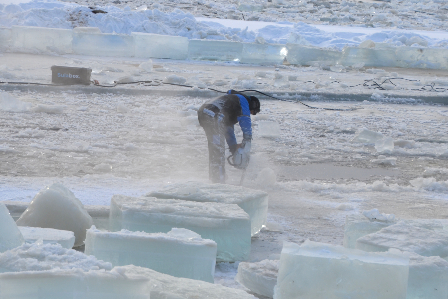 Aus den mächtigen Eisblöcken, die für den Wettbewerb mit einer Motorsäge aus dem Fluss gesägt wurden, wurde ein Stück weiter die Wände der Eissauna für die Schwimmer errichtet. Das Tageslicht dringt hindurch. Dach und Sitzbänke sind aus Holz, es ist Platz für etwa 40 Personen. Aufgrund der Größe gibt es zwei Öfen. Die Anwendung ist etwas begrenzt, damit sie möglichst lange hält und auch für die Öffentlichkeit noch zur Verfügung steht. Die Wände sind zwar dick, aber bei Saunahitze schmelzen sie eben doch irgendwann. Die letzten Schwimmwettbewerbe sind am Samstag.