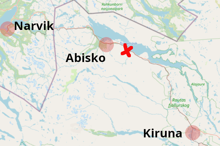 Die Unglücksstelle liegt zwischen Stordalen und Kaisepakte südöstlich von Abisko. Karte sel/ openstreetmap
