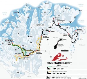 Die Streckenführung der diesjährigen Auflage des Schlittenhunderennens unterscheidet sich etwas von den vergangenen Jahren. Karte Finnmarksløpet