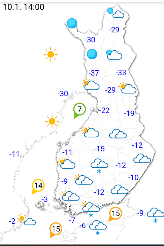 Den Kälterekord der Saison hält aktuell Savukoski Tulppio: Dort wurden gestern Morgen -42,8°C gemessen. Auch in der norwegischen inneren Finnmark gab es Temperaturen von unter 40°C .