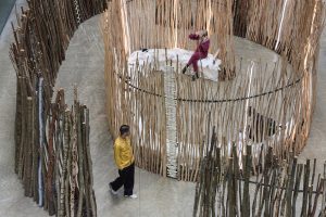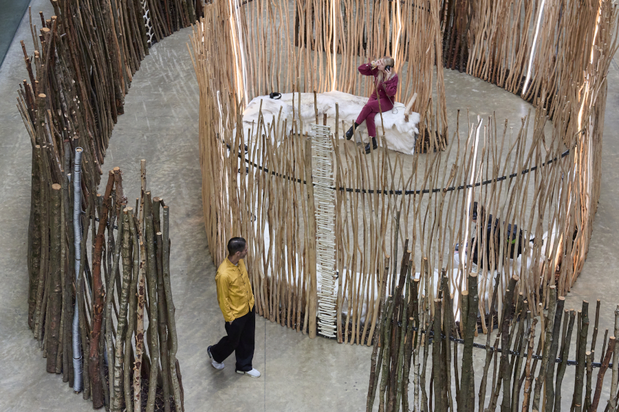 Rentiere verfügen auch über Nasen, die in weniger als einer Sekunde bitterkalte Außenluft um bis zu 80 °C aufheizen können. Das lernen wir in Geabbil, einer aus meterhohen, abgeschälten jungen Bäumchen labyrinthartig zusammengestellten Installation, die wie eine begehbare Rentiernase geformt ist. Einige Bäumchen tragen Ohrmarken wie die Rentiere selbst. Auch verschiedene Gerüche sind als Element beigefügt.