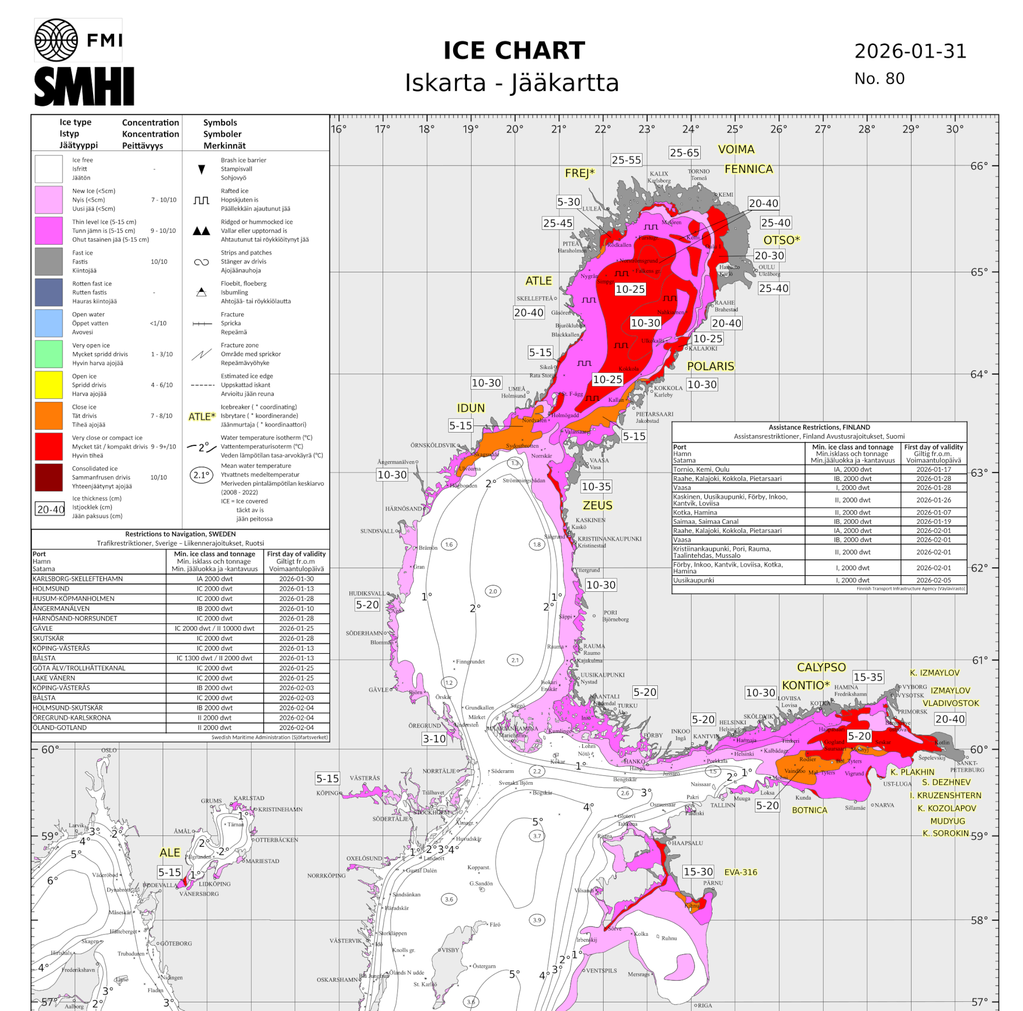 Eiskarte 31. Januar 2026 von SMHI und FMI, nördlicher Teil. Komplette aktuelle Eiskarte jeweils hier.