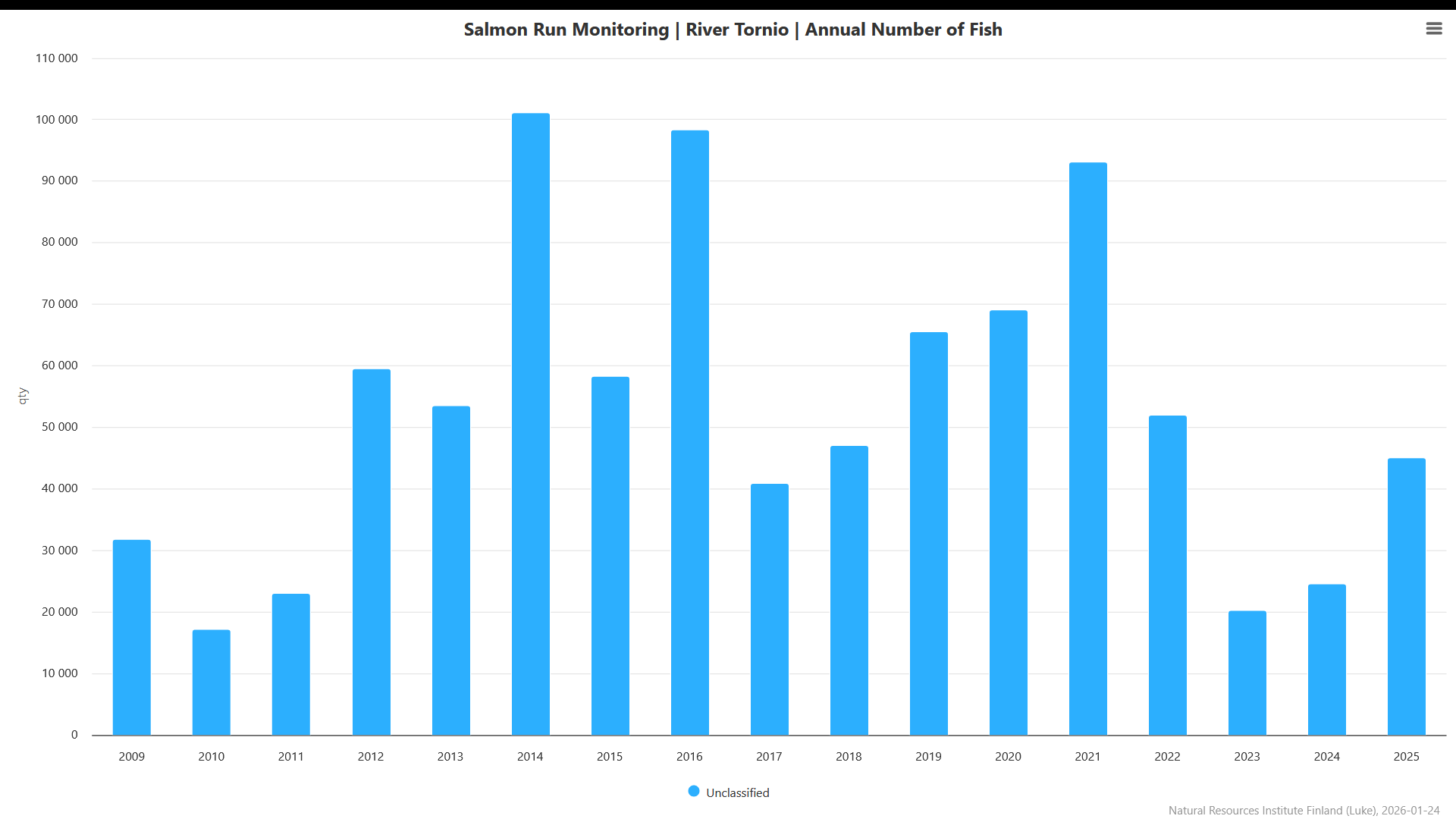 Die Lachsaison 2025 hatte nicht gut begonnen. Zunächst sah es in vielen Flüssen so aus, als kämen noch weniger Lachse zurück als im schon schlechten Vorjahr, auch im Tornefluss (finnisch Tornionjoki, schwedisch Torneälven). Wegen der beiden schlechten Jahre 2023 und 2024 war die Lachsfischerei dort schon seit April beschränkt worden, sowohl für Berufsfischer als auch für Hobbyangler. Ab Mitte Juli zählte das Echolot jedoch mehrere Tag lang über 1000 Fische täglich, und insgesamt endete die Saison mit gut 45 000 flussaufwärts wandernden Lachsen. Etwa ein Drittel davon waren sogenannte „Grilse“, junge Lachse, die nach einem Jahr in der Ostsee zurück in den Tornefluss kamen – gut fünf Mal so viele wie 2024. Diese große Zahl mache Hoffnung darauf, dass auch dieses Jahr viele zurückkämen, dann als mittelgroße Lachse, so Luke-Fischexperte Ville Vähä. Dass die Zahlen insgesamt wieder höher liegen als zuletzt, führte er gegenüber Yle auf eine stärkere Beschränkung der Fischerei in der Ostsee und günstigere Bedingungen für den Fisch zurück.