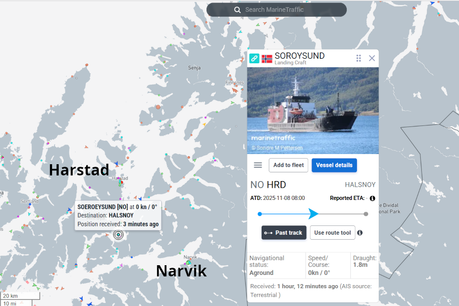 Die MS Sørøysund ist im Tjeldsund auf Grund gelaufen. Karte Marine Traffic/ sel