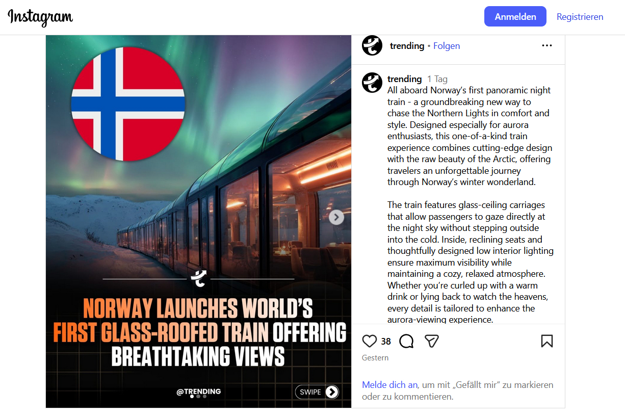 Narvik (Norwegen). Tolle Sache: Ein Panoramazug mit Glasdach, um Nordlichter zu sehen. Unterwegs auf der Strecke von Narvik nach Katterat, wo wenig künstliches Licht das Erlebnis stört. Das versprachen Anzeigen auf Social Media und sogar Artikel in Reisezeitschriften. Das Problem: Den Zug mit Glasdach gibt es gar nicht. Das Bild ist mit KI erstellt. Darüber berichtete NRK.